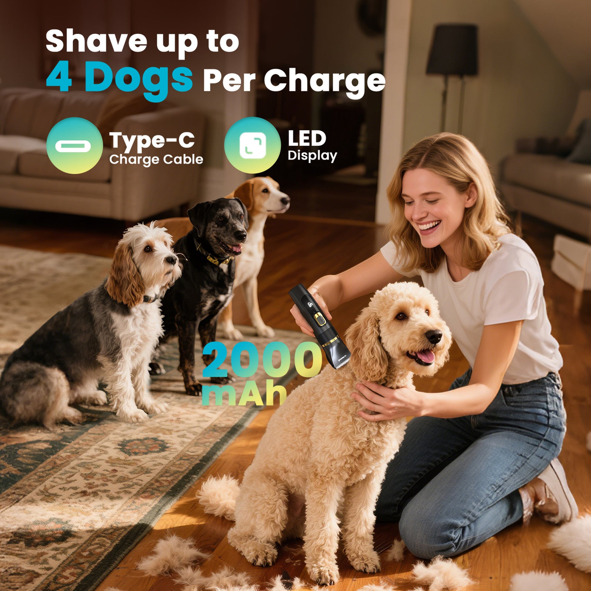 [Long Battery Life & Cordless Convenience] - A built-in 2000mAh battery delivers up to 3.5 hours of runtime per charge. Groom up to four small dogs without interruption. The LED display shows real-time battery status, and you can also use it corded while charging for unlimited use anywhere.