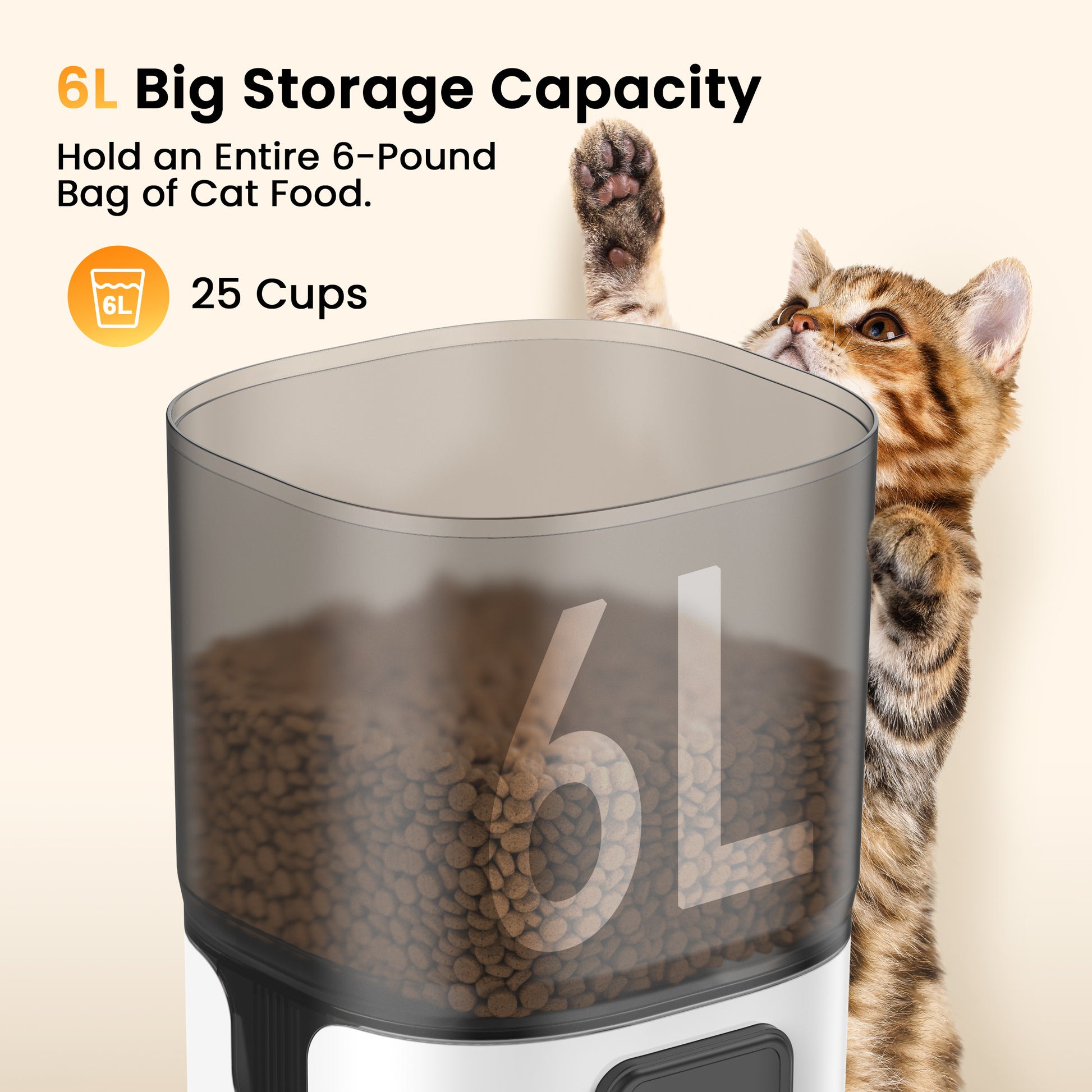 [6L/25 Cup Large Capacity] - Boasting a substantial 6L/25 cup capacity, the Oneisall cat automatic feeders can store up to 25 cups of dry food (approximately 5.5 pounds). It allows precise portion control, accommodating the dietary needs of one adult cat for 10-15 days. (Note: 1 Portion ≈ 15 Grams ≈ 1/12 Cup. It is recommended to use 0.2-0.5 inches of dry non-sticky pet food and 0.4 inches of freeze-dried size. The portion means the kibble amount of each bowl.