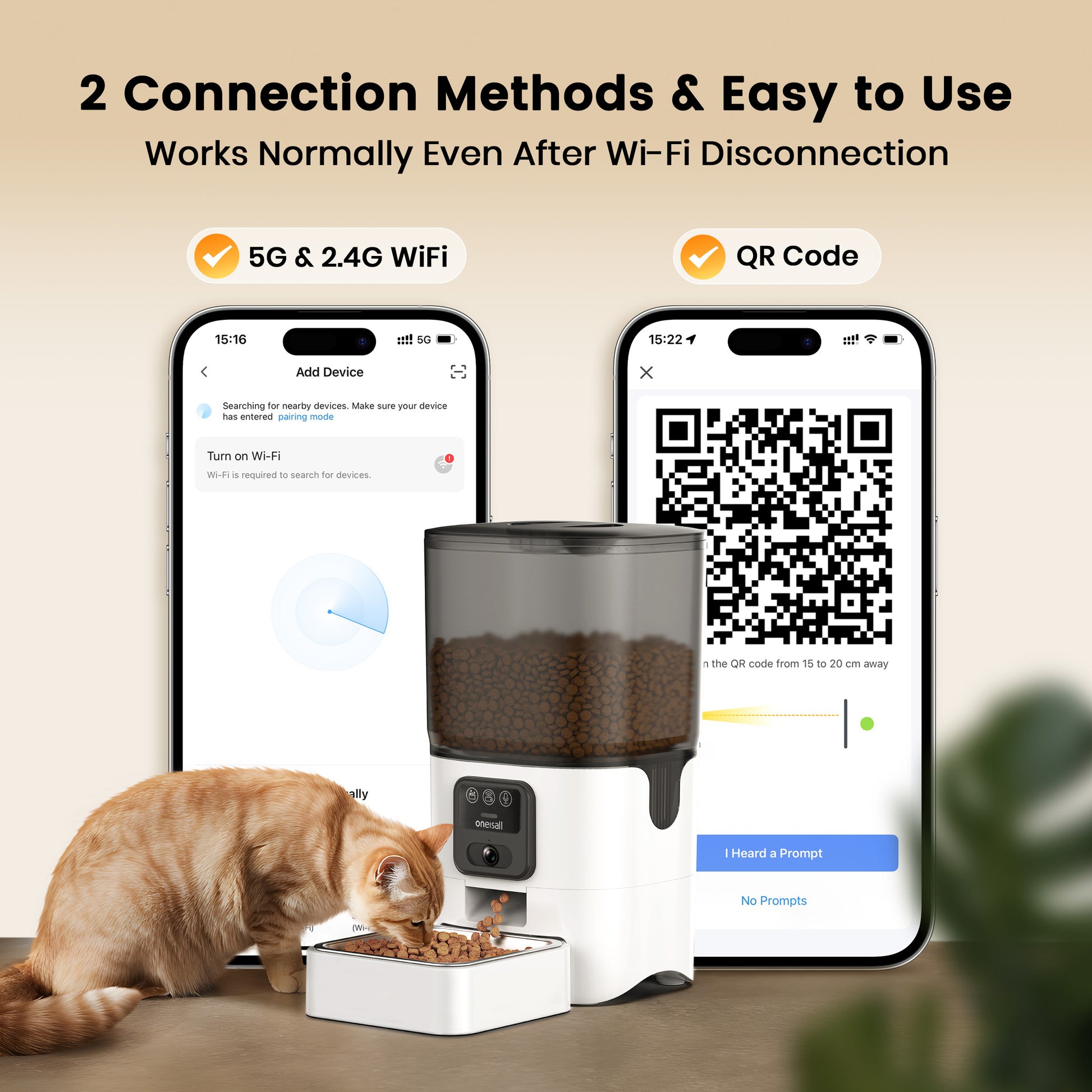 [Connection Method 1 - 2.4GHz & 5GHz Wi-Fi Connectivity] - Oneisall cat feeder automatic supports 2.4GHz and 5GHz frequency bands and has a built-in Bluetooth module that automatically pops up when connected to ensure a stable and flexible connection.